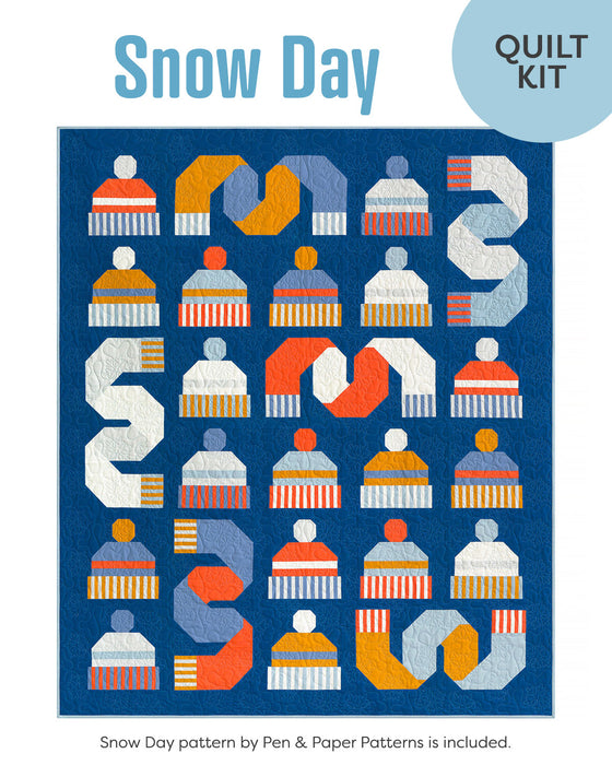 The Snow Day quilt kit includes the Snow Day quilt pattern by Pen & Paper Patterns and fabric for the quilt top and binding. All Kona solids are labeled so you won't have to guess what's what. Binding color is Kona in Fog. If you'd like a different in-stock Kona color, please contact us to request it.